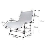 Stražnja ploča foto stola je podesiva i može se učvrstiti na mjesto pomoću isporučenih stezaljki. Osim toga, stol ima maksimalnu duljinu od 200 cm i podesivu visinu između 63 i 100 cm.